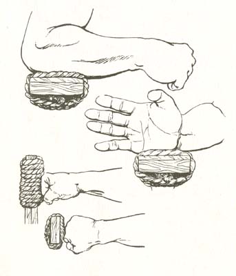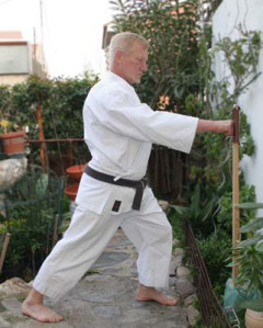 The “makiwara” is an upstanding striking board of certain dimensions and flexibility. It is embedded in its base and free at the top. The upper end is surrounded by a thick leather covering or by a piece of rice rope. The dimensions of the “makiwara” are such that when striking its upper end it will bend absorbing the power of the blow. We know that all action is counteracted by a reaction of the same magnitude and contrary direction. The “makiwara” will thus transmit to our body the same power, but in the contrary direction. With each impact the muscles absorb power, the connecting tissues are strengthened, the hands are trained, the mind focuses, the sight-hand connection becomes more precise and the desire to generate power also increases. Ultimately, we are contributing to increase the “atemi” or concentrated destructive power. Through “makiwara” practice we improve our technique and get a better understanding of our blows. After a first stage it will become evident that there is little to gain by confronting a “makiwara” to simply hit it. Better results are obtained if we use this equipment intelligently and put emphasis on improving our general performance and not only on increasing our “atemi”. At the beginning we will try to concentrate all our energy on a focus or point of impact. The objective is that with time, the focus, the “makiwara” and our own being become one (without perceivable differences).